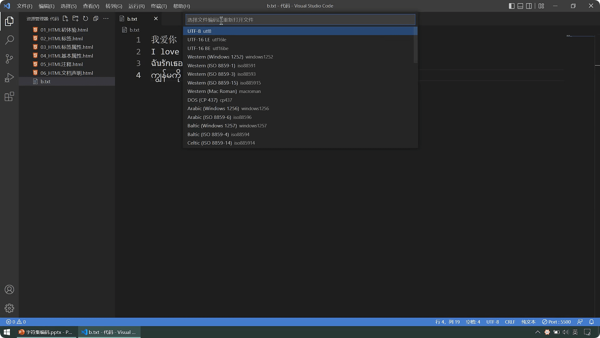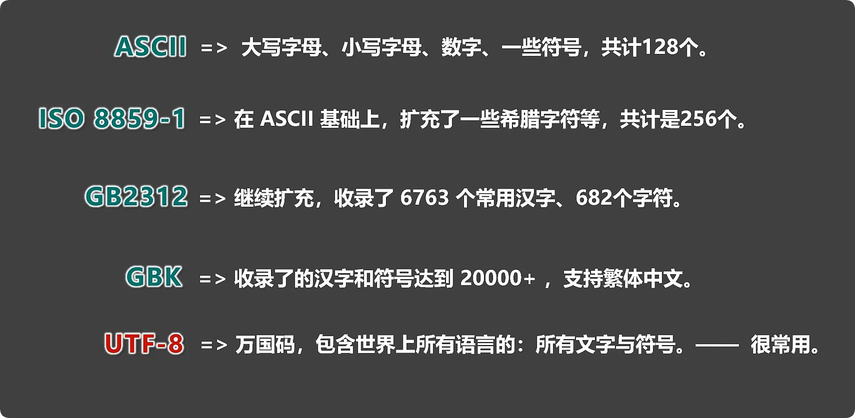 UTF-8:Ken Thompson、Rob Pike推出,包含世界上所有语言的,所有文字与符号,是主流且默认网页编码