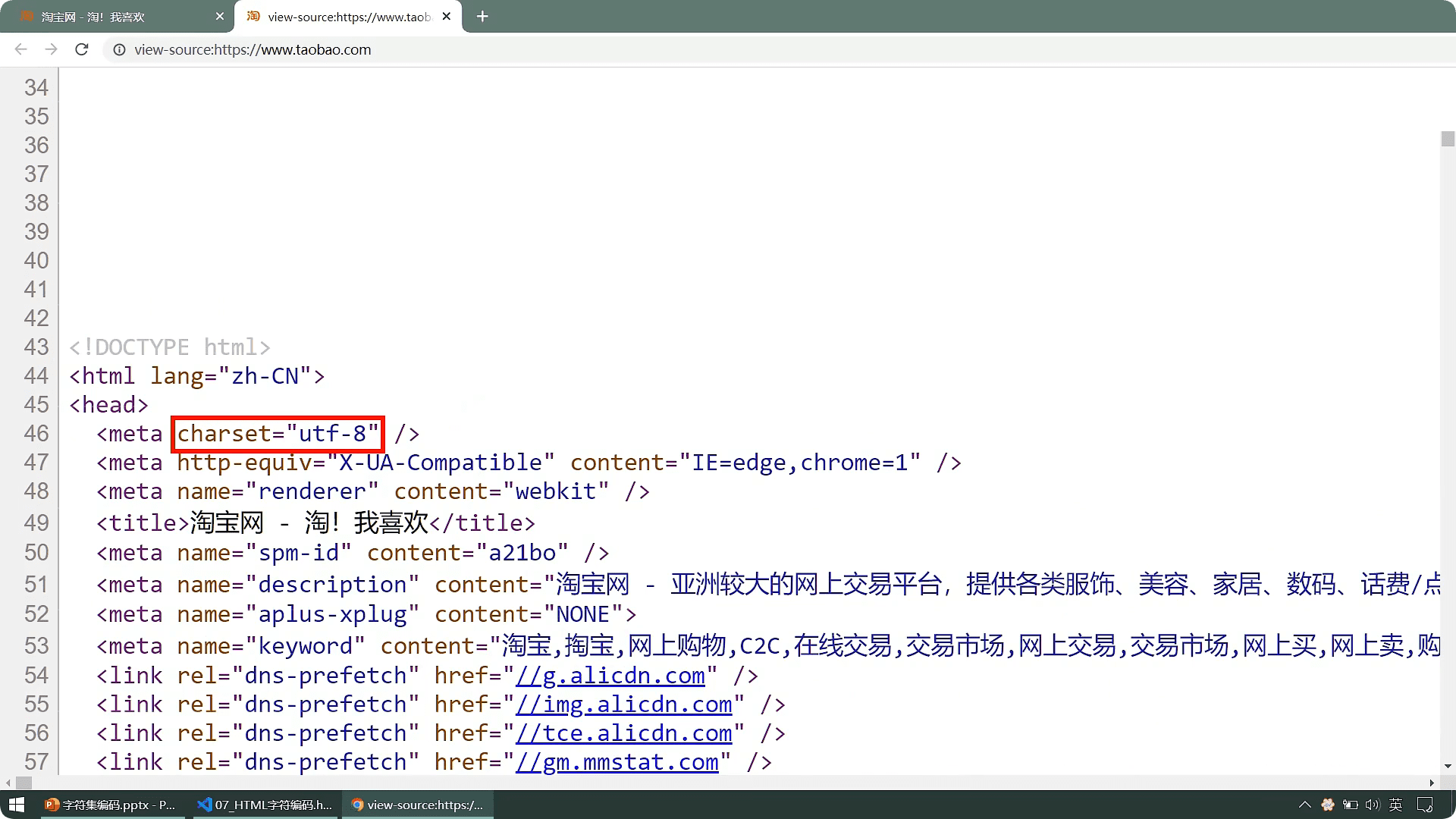 我们在淘宝查看网页源代码,也能看到指定了UTF-8编码