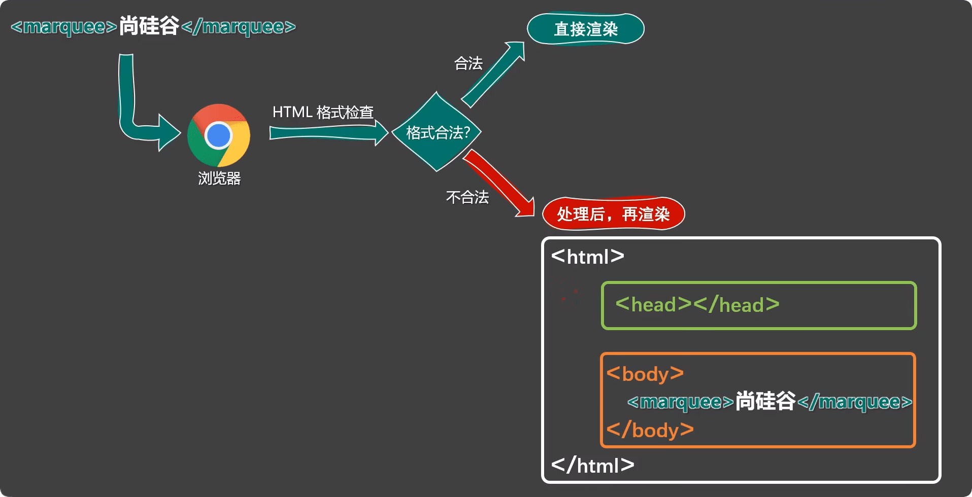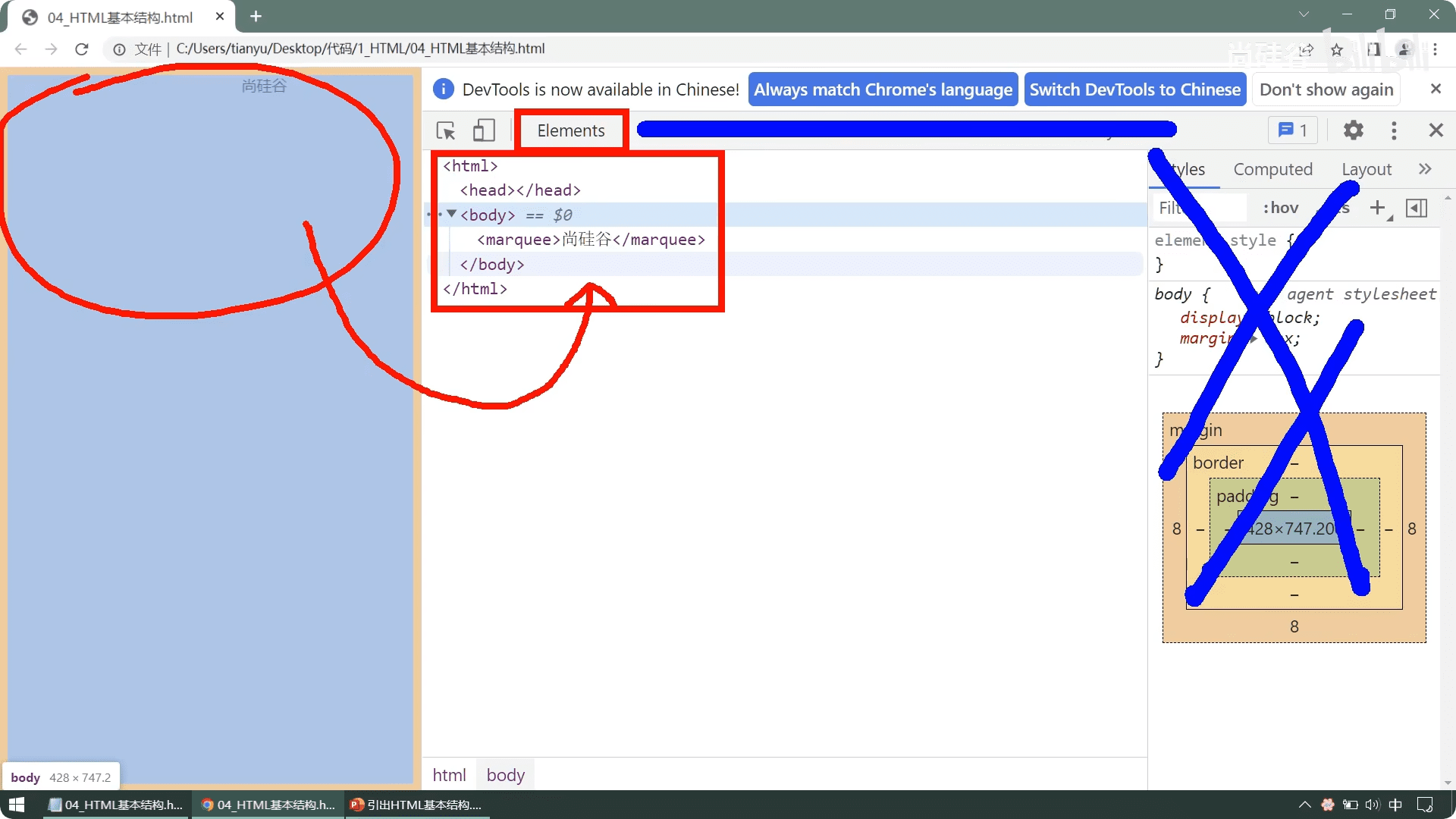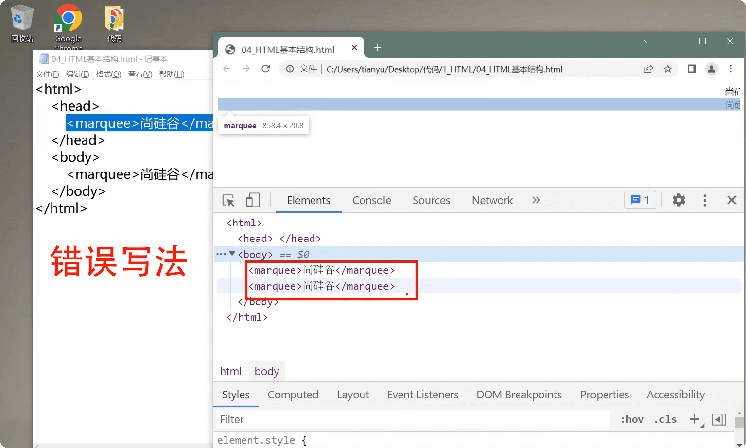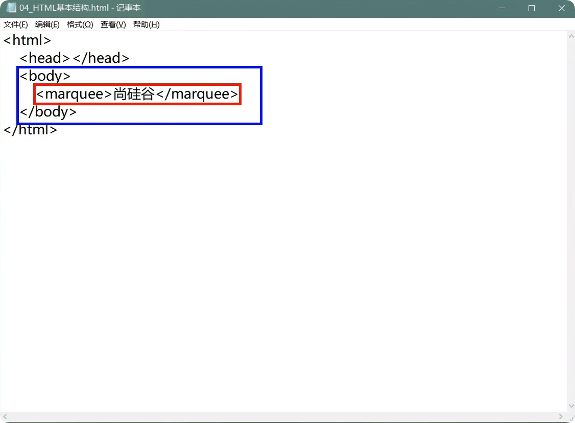 我们只写了 <marquee> 这一段,而浏览器给我们补全了