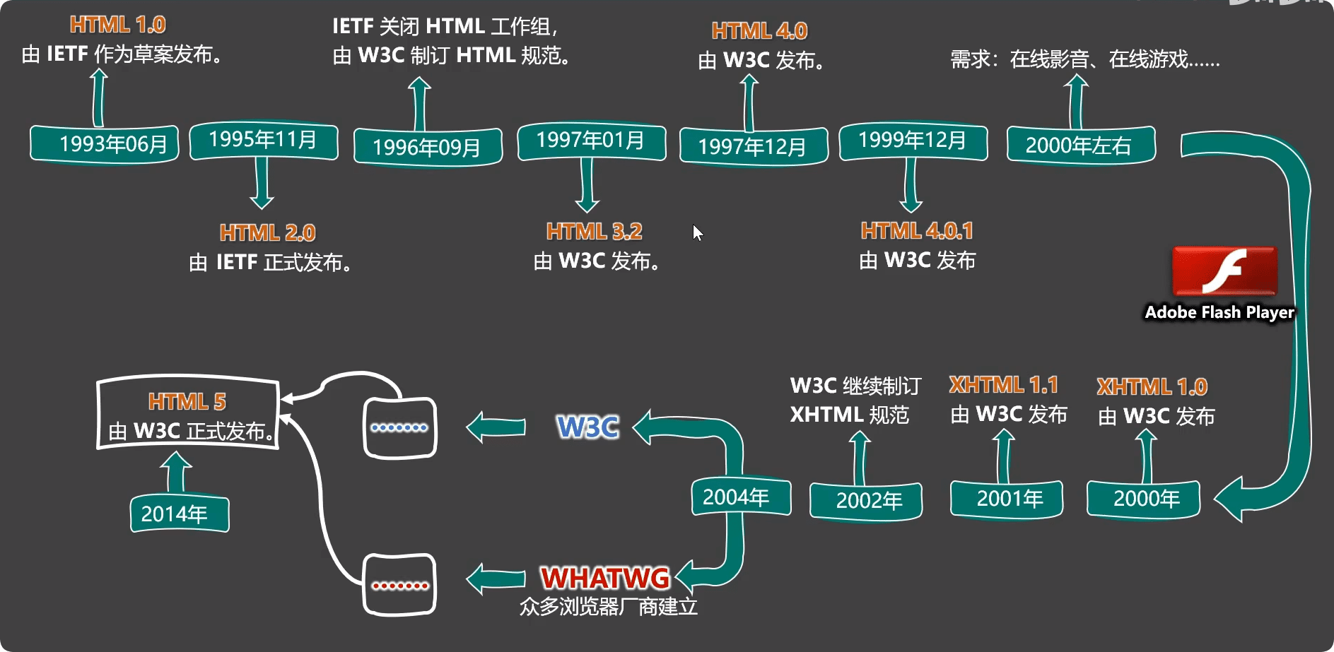 由于2004年W3C执着于发布新规范XHTML,而不是去更新HTML,引起众多浏览器厂商不满,于是他们联合组建了 WHATWG 并开始制定 HTML5
