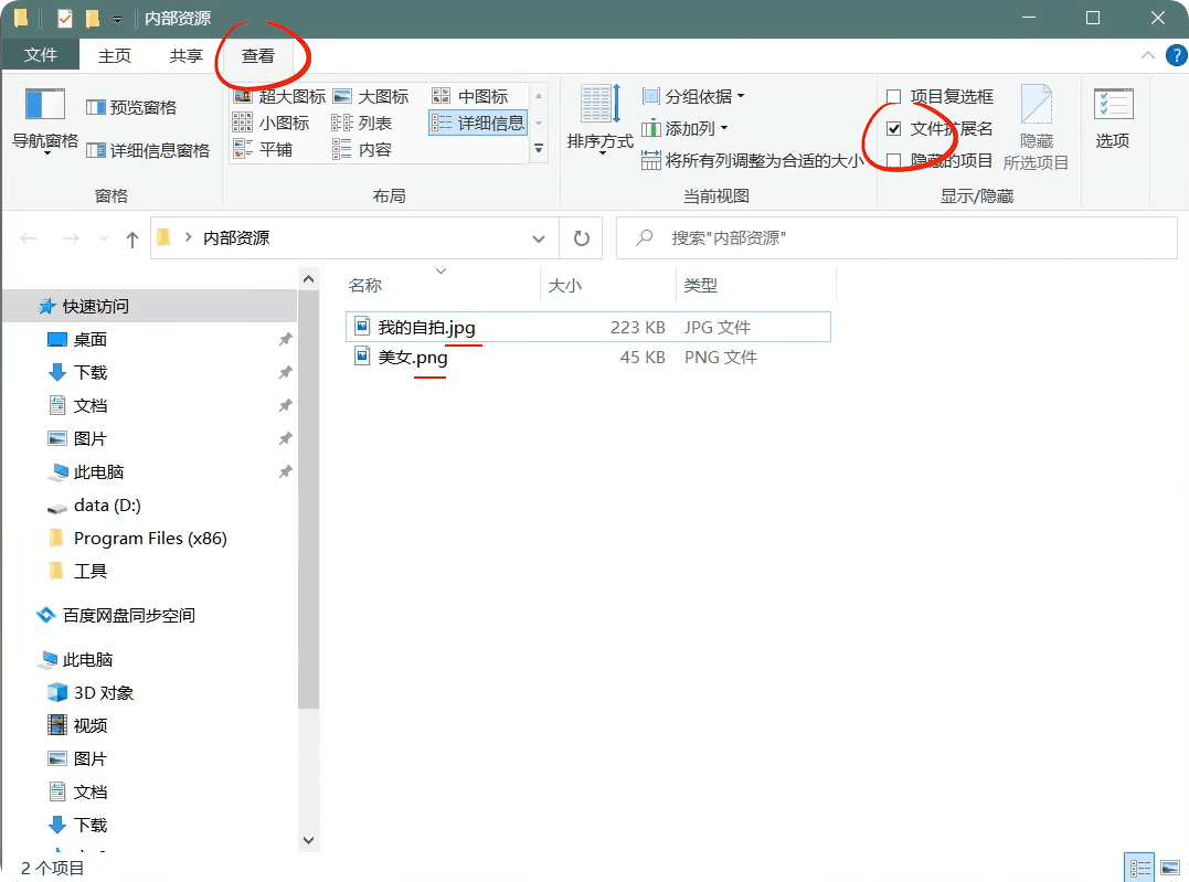 打开文件夹 - 上方查看标签 - 勾选 文件拓展名