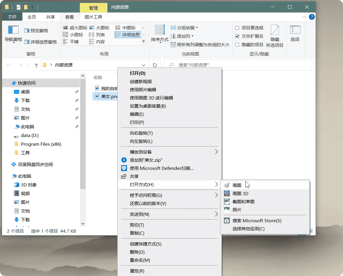 图片一般默认的是微软自带的软件,如果不喜欢,可以鼠标右键-打开方式中选择更换
